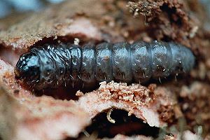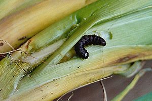 1, erwachsene Raupe im Wurzelstock von Iris pseudacorus und