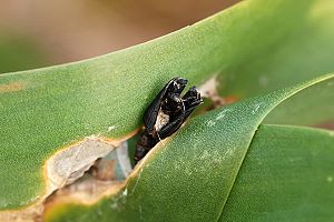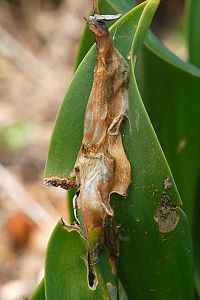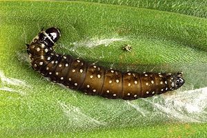 1-2, Raupe und Fraßbild: Spanien, Valencia, Calpe, 100 m, 14. Februar 2010 Puppen und Raupen an Meerzwiebel (Urginea maritima), Falterschlupf ab 19. Februar 2010 (leg., cult. & fot.: Herbert Stern), det. Jürgen Rodeland & Rudolf Bryner [Forum]