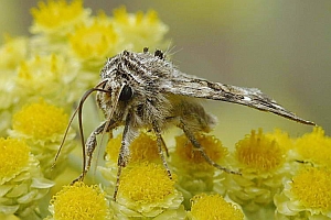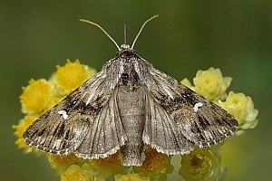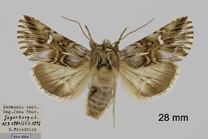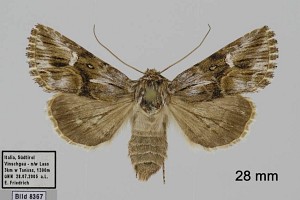 14, ♀: Österreich, Steiermark, Graz, Schöckl (Grazer Hausberg), sonnige Forststraße, ca. 1200 m, Raupe aus der Vegetation (incl. Leinkraut) gekeschert am 7. Juli 2020, Falterschlupf in Zucht 20. Februar 2021 (leg., cult., det. & Foto: Horst Pichler) [Forum]