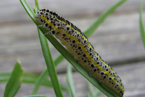 1, parasitierte Raupe: Deutschland, Niedersachsen, Rodenberg, Vorgarten mit wenigen Pflanzen Linaria spec., 90 m, 3. September 2013 (Foto: Tina Schulz) [Forum]