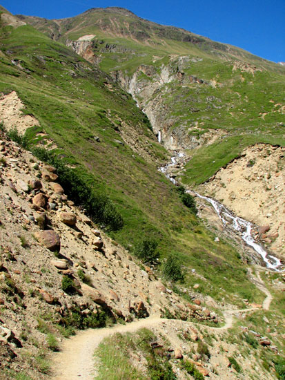 1-2, erodierte Hangbereiche über Urgestein (Pflanzen u. a. Hieracium intybaceum, Sempervivum montanum und Linaria vulgaris): Österreich, Nordtirol, Ötztaler Alpen, Rofental, etwa 2150 m, 19. August 2008 (Fotos: Markus Schwibinger) [Forum]