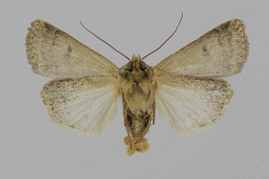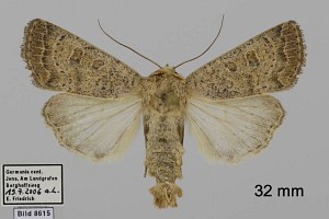 Vorderflügel hell graubraun (beige) mit verstreuter schwarzer Beschuppung, die im Basalfeld und in den Makeln meist am stärksten ausgeprägt ist. Hinterflügel beim Männchen weißlich mit graubraunem Außenrand, beim Weibchen graubraun mit dunklen Adern. [Axel Steiner]
